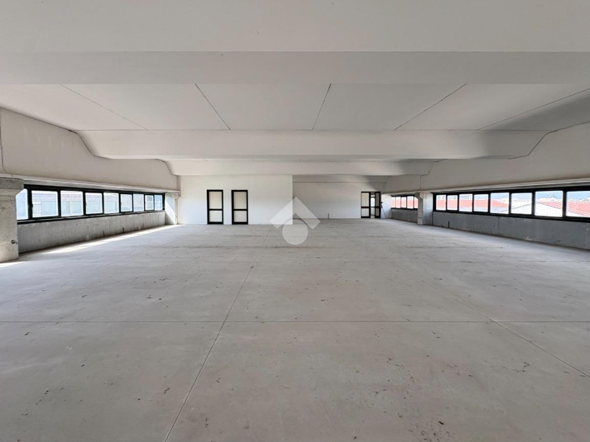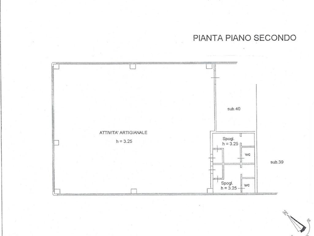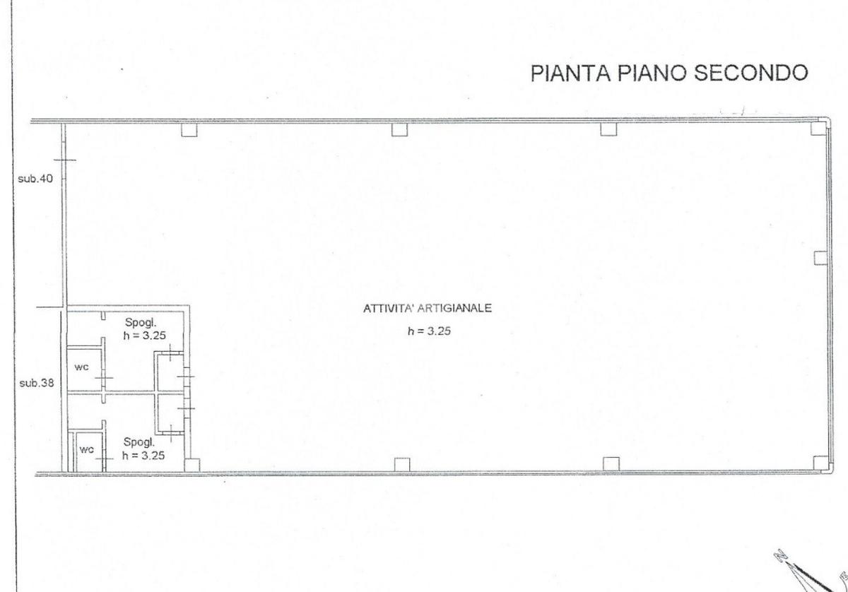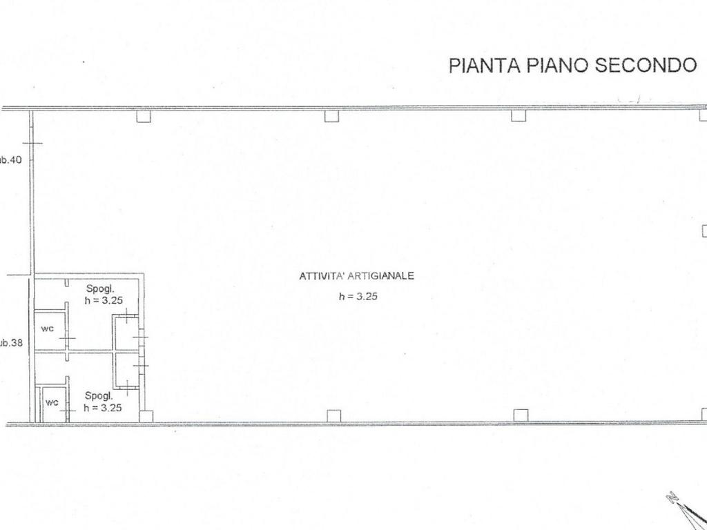In quest’ultima porzione l’accesso al vano scale avviene dall’interno, dal quale si raggiunge la seconda parte di uffici al primo piano di 320 mq con un’altezza di 3,57 m anch’esso dotato di servizi.