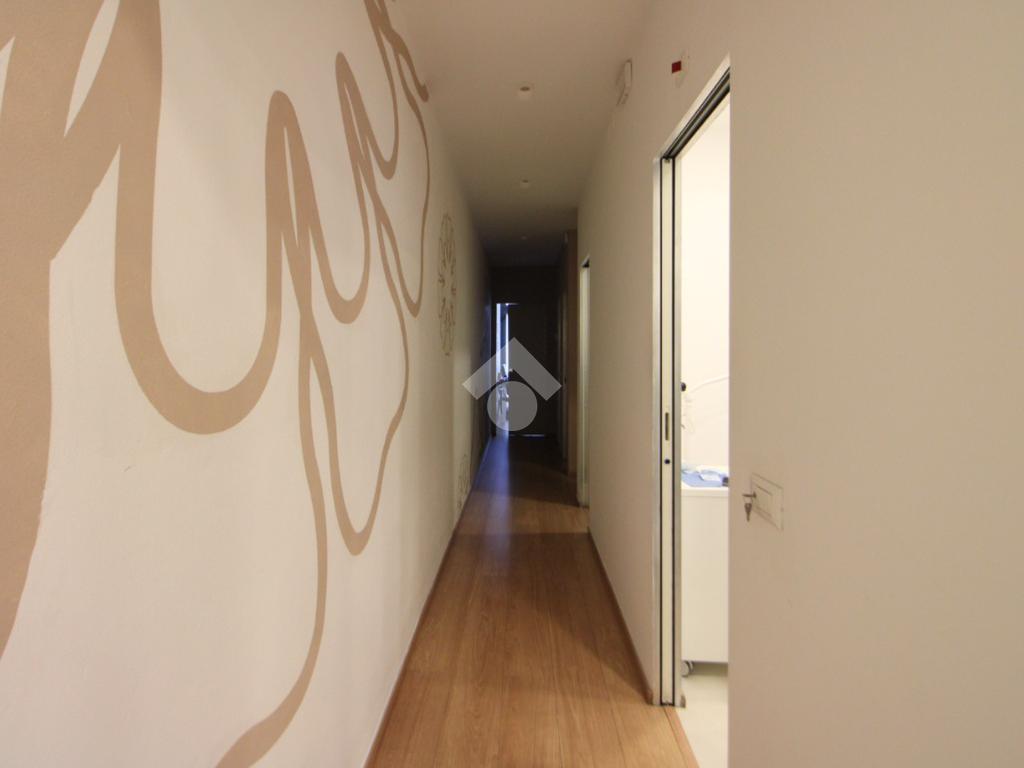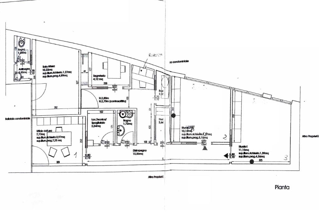 Proseguendo troviamo, a sinistra, due locali rispettivamente di 13 e 12 mq e uno più piccolo di 3 mq; a destra un ufficio di 9 mq e un locale tecnico di 3 mq.