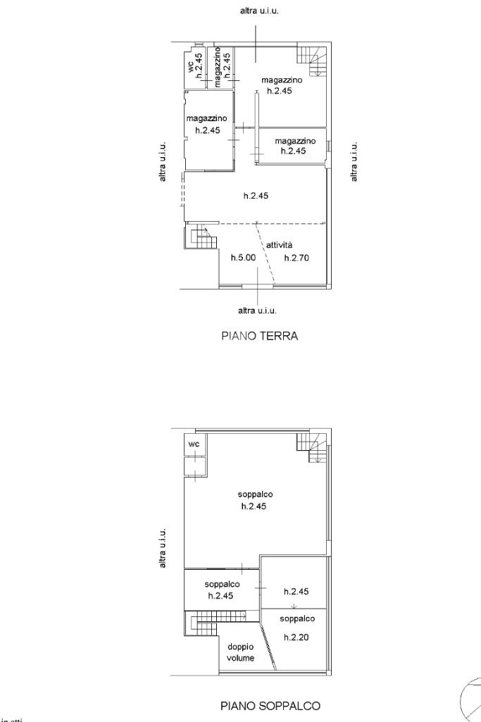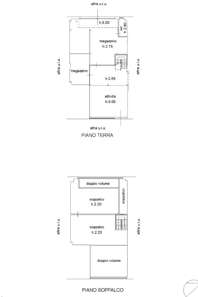 Quest’ultima si sviluppa sia al piano terra con un unico ambiente di 90 mq sia al primo piano soppalcato di 80 mq. Anch’esso è dotato di portellone industriale, posto sul retro dell’immobile il quale porta alla tettoia esterna di circa 100 mq.